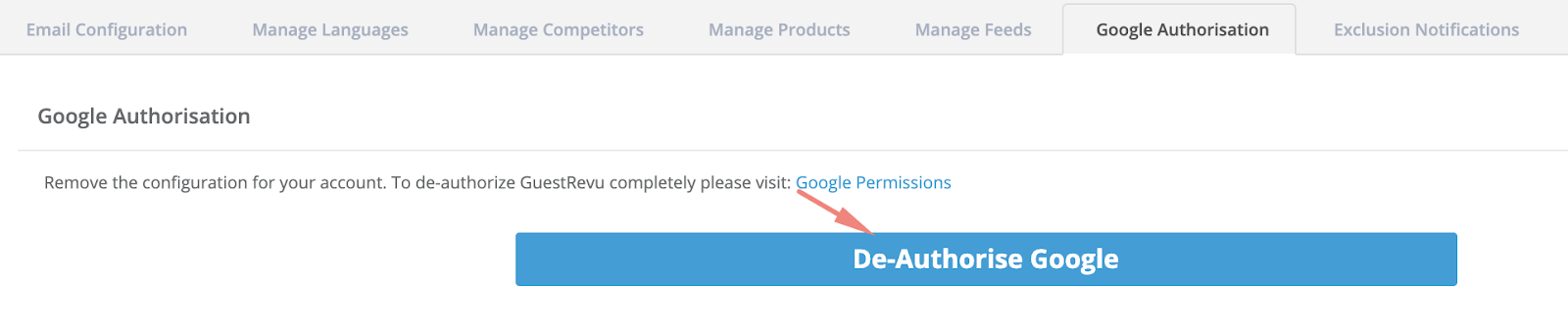 - Click on Account Preferences in the menu on the left-hand side of the dashboard, then on the Google Authorisation tab, and then click on the button that says De-Authorise Google.