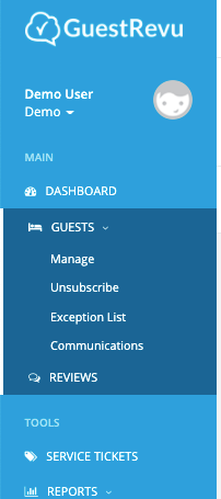 - In the main menu on the left, click Guests > Manage, or click Reviews