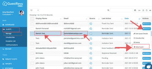 - A. On the Manage Guest screen, click on the guest’s name or email, or click Actions > View Guest, and the guest details will slide in, showing you the guest’s information and any feedback they may have given you.
