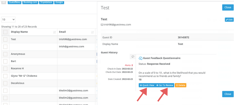 Once the guest details are displayed, you can then click Quick View or Go To Review to see the full review.